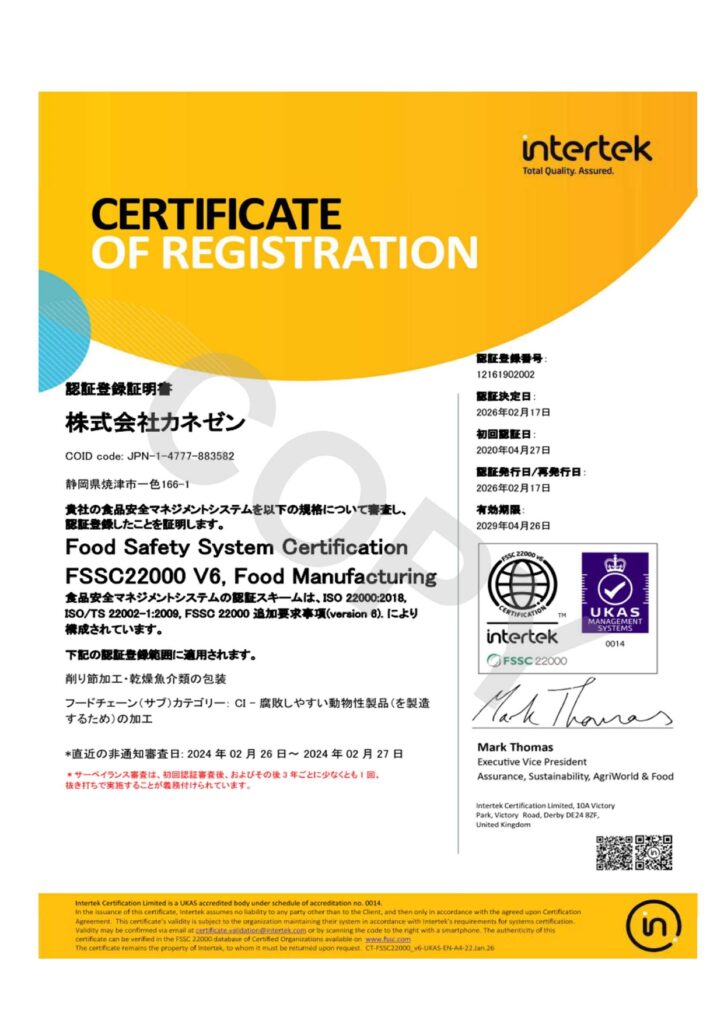 本社工場で取得しておりますFSSC22000につきまして、本年度の定期更新審査を経て、認証更新が完了いたしました。